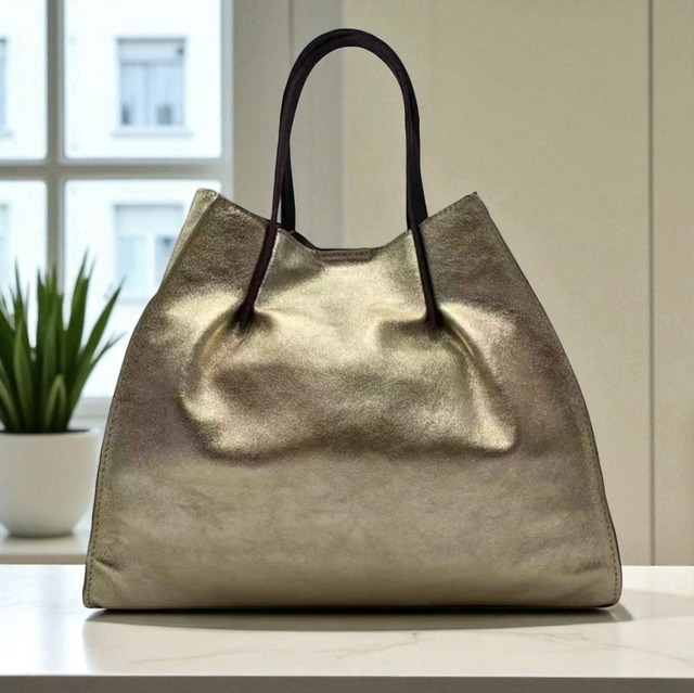 【お知らせ】この商品は在庫1点のため、売り切れ次第終了です 【ゴージャスかつ上品なゴールドのトートバッグ】 イタリアらしい個性的なデザインのトートバッグです。シンプルなお洋服に、ゴールドのバッグが良いアクセントに! 開閉はマグネットボタン、バッグの中はファスナー式のポケットで二つに仕切られています。スマホ用のポケットもついています。収納力抜群のトートバッグです。 ◆原産国:イタリア ◆素材:イタリア製本革 ◆サイズ:39.50cm×34.00cm×17.00cm ◆重さ:0.50kg ~以下の点について、あらかじめご了承の上、ご注文下さい~ ※天然皮革の特性上、若干のシワがある場合がございます。また、多少色移りする場合がございますので、淡色の洋服との摩擦にご注意ください。 ※実際の商品と画像ではモニター画面やブラウザーによって若干色合いなどが異なる場合がございます。 ※上記のサイズ表は製品の実寸です。製品ごとに上記サイズと多少の誤差が生じる場合がございます。