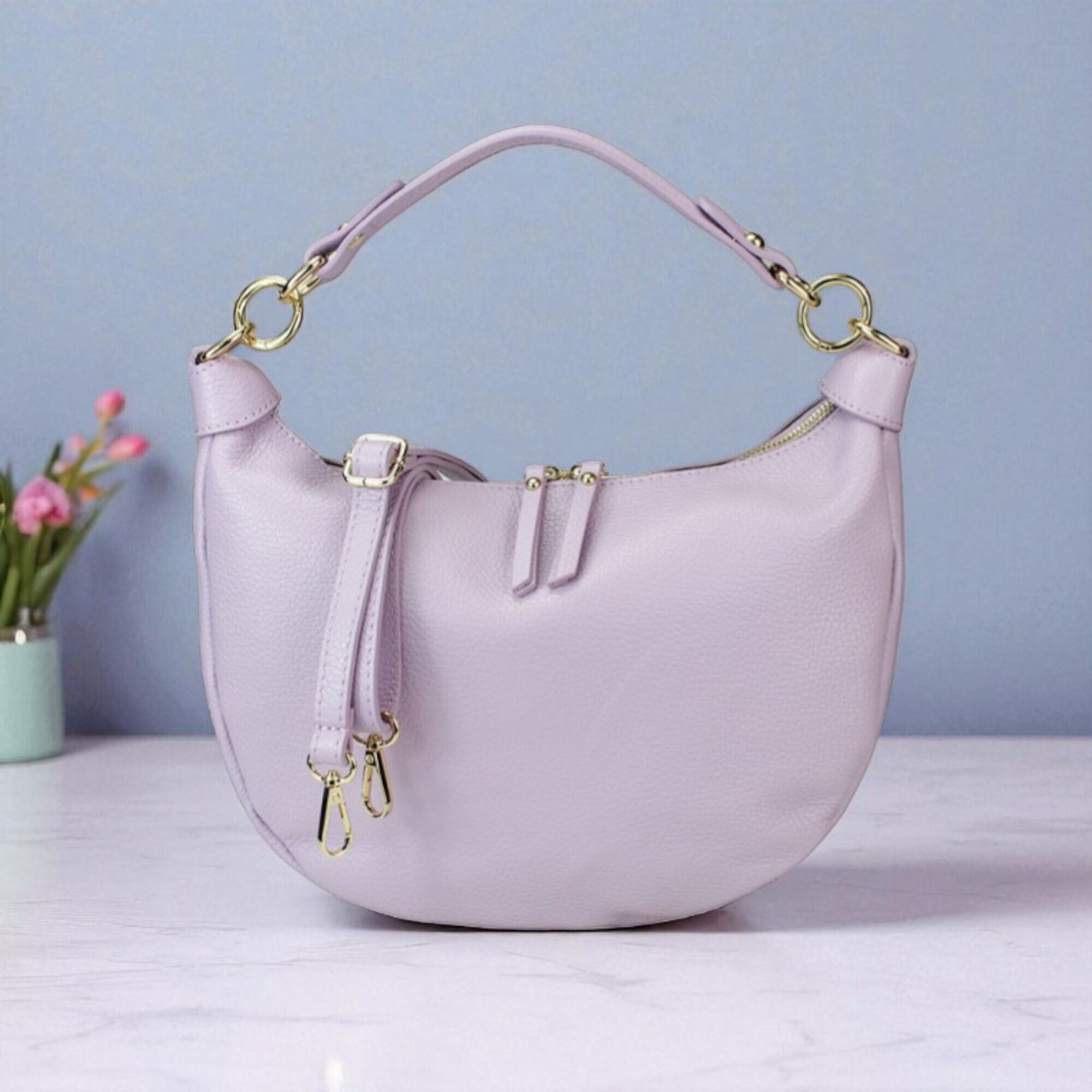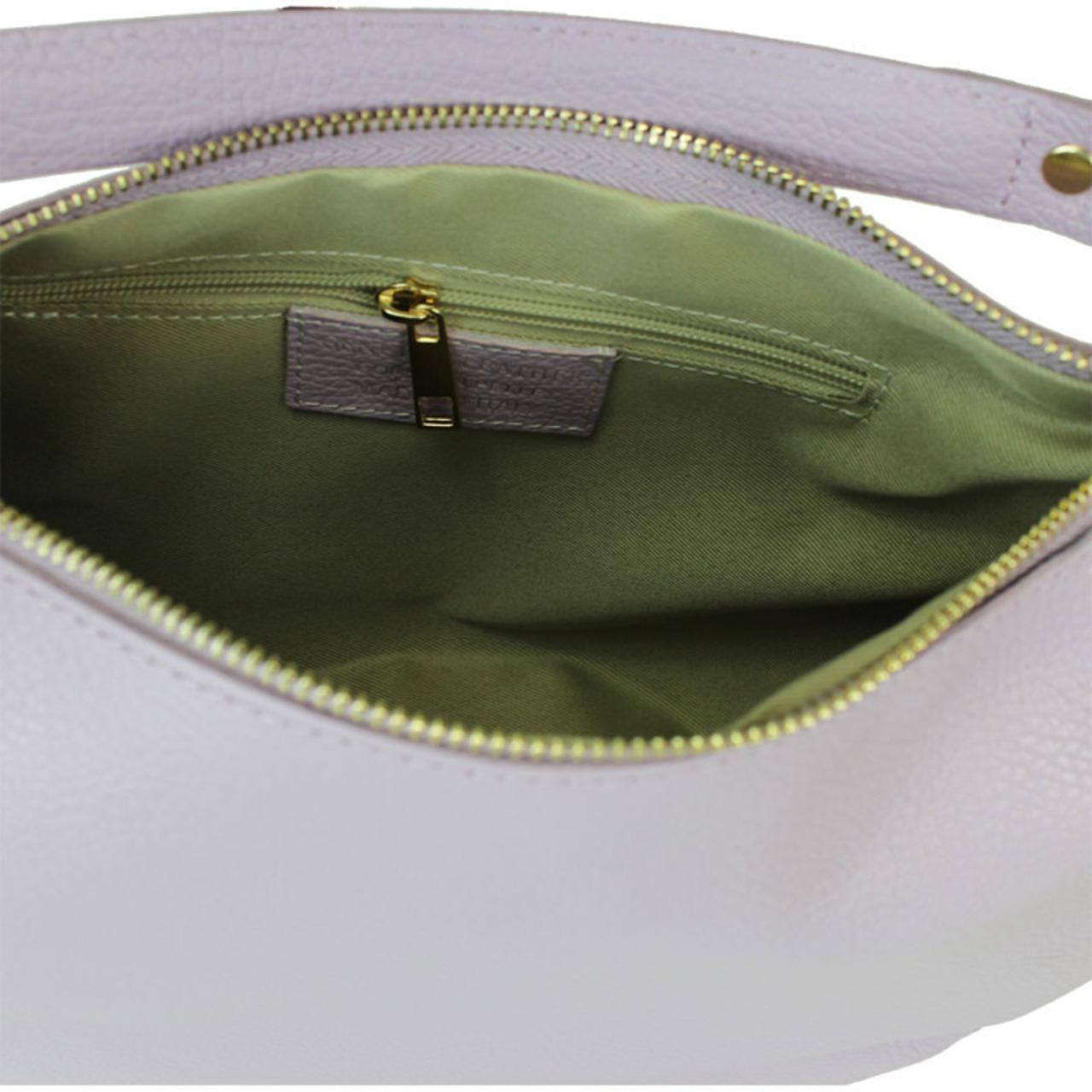 洗練されたデザインのライラックカラーのショルダーバッグは、どんなコーディネートにも合わせやすいアイテムです。表面は高級感あふれる本革を使用しており、上品な雰囲気を演出します。